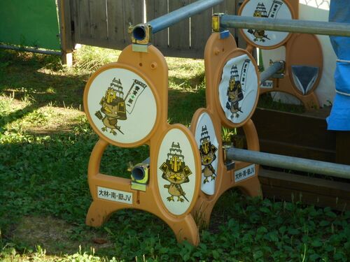 これは2017年8月、弘前城で撮影しました。2009年の弘前城築城400年祭の時に制定されたゆるキャラ、たか丸くん仕様の単管バリケードです。 ……と言っても、シールを張ってたか丸くん仕様にしているだけですね。しかも剥がれかけているところもあるし(^_^;) ポ…