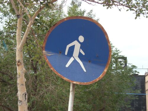 ウランバートル(2008.7) 地味だけど、何か心に残るピクトグラムがあります。これもその1つ。 モンゴルの首都ウランバートルで撮影したのですが、ピクトさん、大股で歩いている感じですね。ブルーの色も良いです。縁取りの茶も良い……っていうか、錆びているだ…