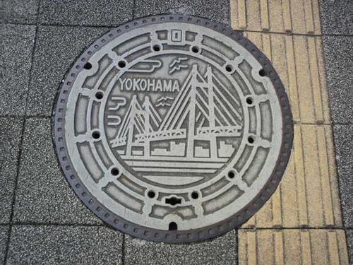 同じベイブリッジデザインでも、細かく見るといろいろあります。 横浜市・横浜ベイブリッジ⑧(点字ブロック)(2020.9) 何製なのか分からないのですが、よく見るものと違い、艶消しで白っぽいんですよ。そして、これまた点字ブロックにめり込んでいます。 manho…