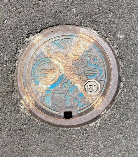 宮津市・仕切弁③(2022.4) 「宮津市・仕切弁②」と同じ、小型の仕切弁の蓋です。こちらは150。しかし、なぜにバッテンがついている? 宮津市・仕切弁④(2022.4) こちらは、地の色が緑がかっていて、かつ100です。 manhole covers in Miyazu, Kyoto prefecture, …