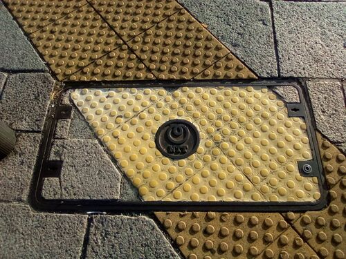 横浜市・NTT⑩(2025.1) 「横浜市・NTT⑥」と似ていますが、右下の鍵穴部分が違います。 周囲の舗装に擬態していますが、点字ブロックの色の違いでバレています(?)。 横浜市・市章㉓-2(2025.1) ご紹介済みのデザインですが、周囲の舗装への擬態が完璧……なよう…