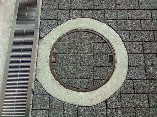 横浜市・丸㉒-3(2025.1) お顔系ですね。なかなか良い感じに擬態していますが、すべてほぼ正方形のタイルで構成されていること、何よりも周囲を取り巻くコンクリートでバレています。最近、こういう風に周囲がコンクリートのマンホール蓋をよく見かけるのです…