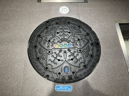 東京都・合流⑪(管敷設、T-25)(2025.11) めちゃくちゃきれいですが、それはこれが東京都虹の下水道館の展示蓋だから。 ちなみに下部に青いゴムキャップがありますが、これは「仮設トイレの設置可能なマンホール」であることを意味します。 仮設トイレ(虹の下…