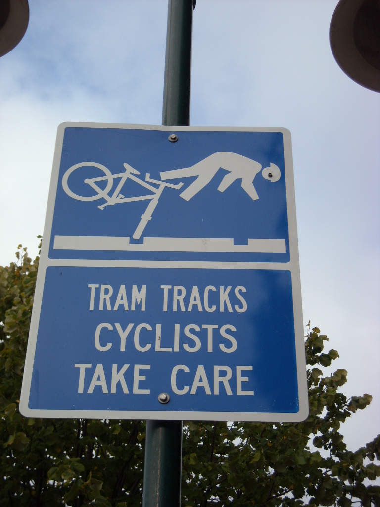 2019-08-22 【ピクトグラム】ニュージーランド ピクトグラム、標識 ニュージーランド(2008.3) クライストチャーチで撮影。 路面電車の線路の溝に、自転車の車輪をひっかけて転ばないよう気を付けてね、ってことなのでしょうが、何か怖いです(^-^; 勢いといい、目があることといい。