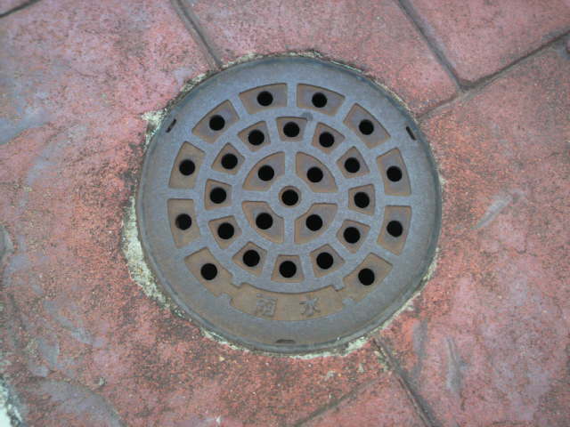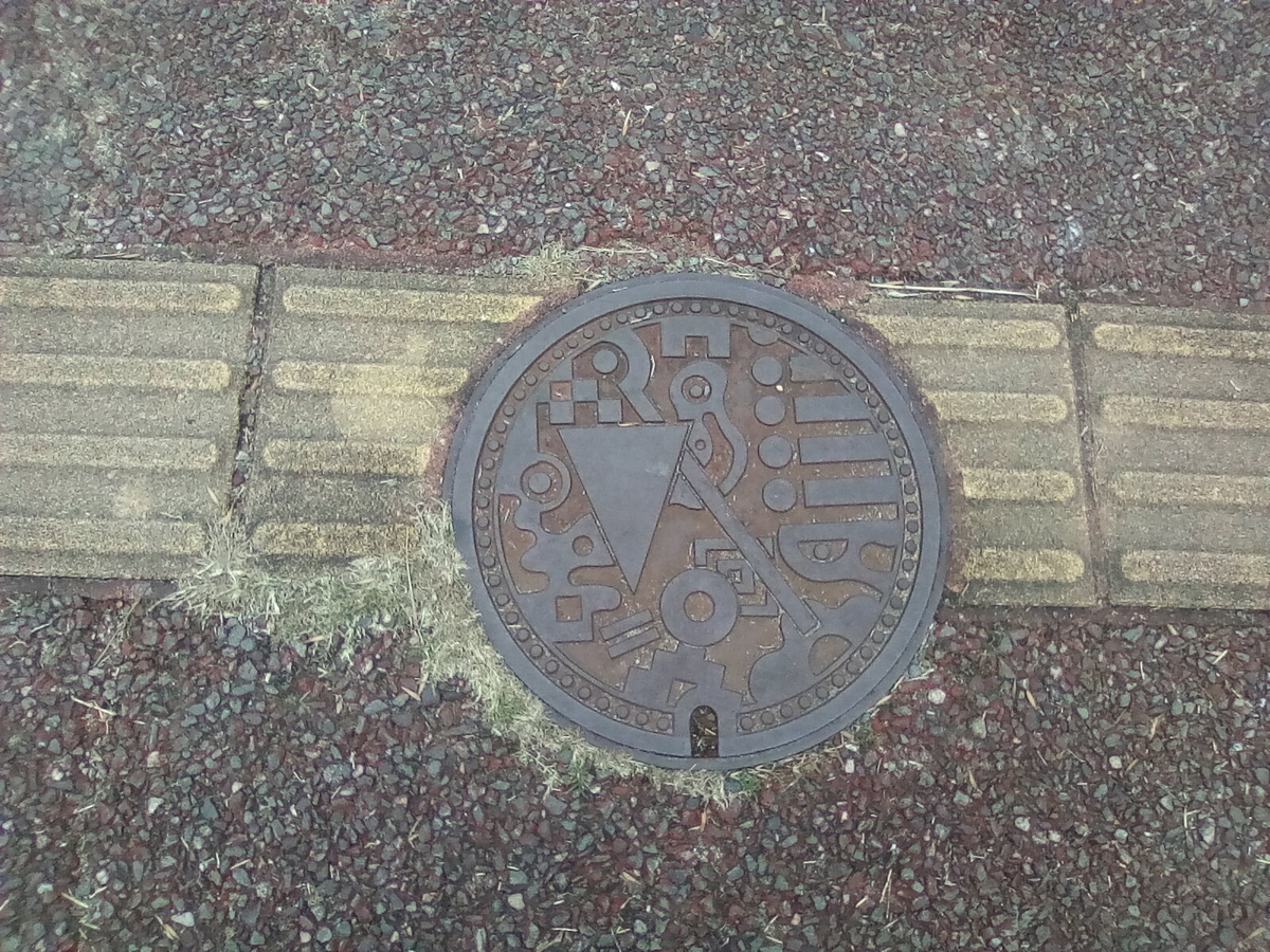 このデザインのマンホール蓋は、似て非なるデザインが多いのですが、これは「12時方向に特徴がない」のが特徴です。左側の三角形に刻みがないので、平成18年以前に設置されたものですね。